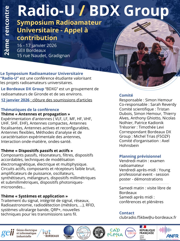 Un appel a contribution est lancé pour participer à la deuxième rencontre Radio Clubs universitaires – Bordeaux DX Group à l’IUT GEII, situé au 15 rue Naudet à Gradignan.