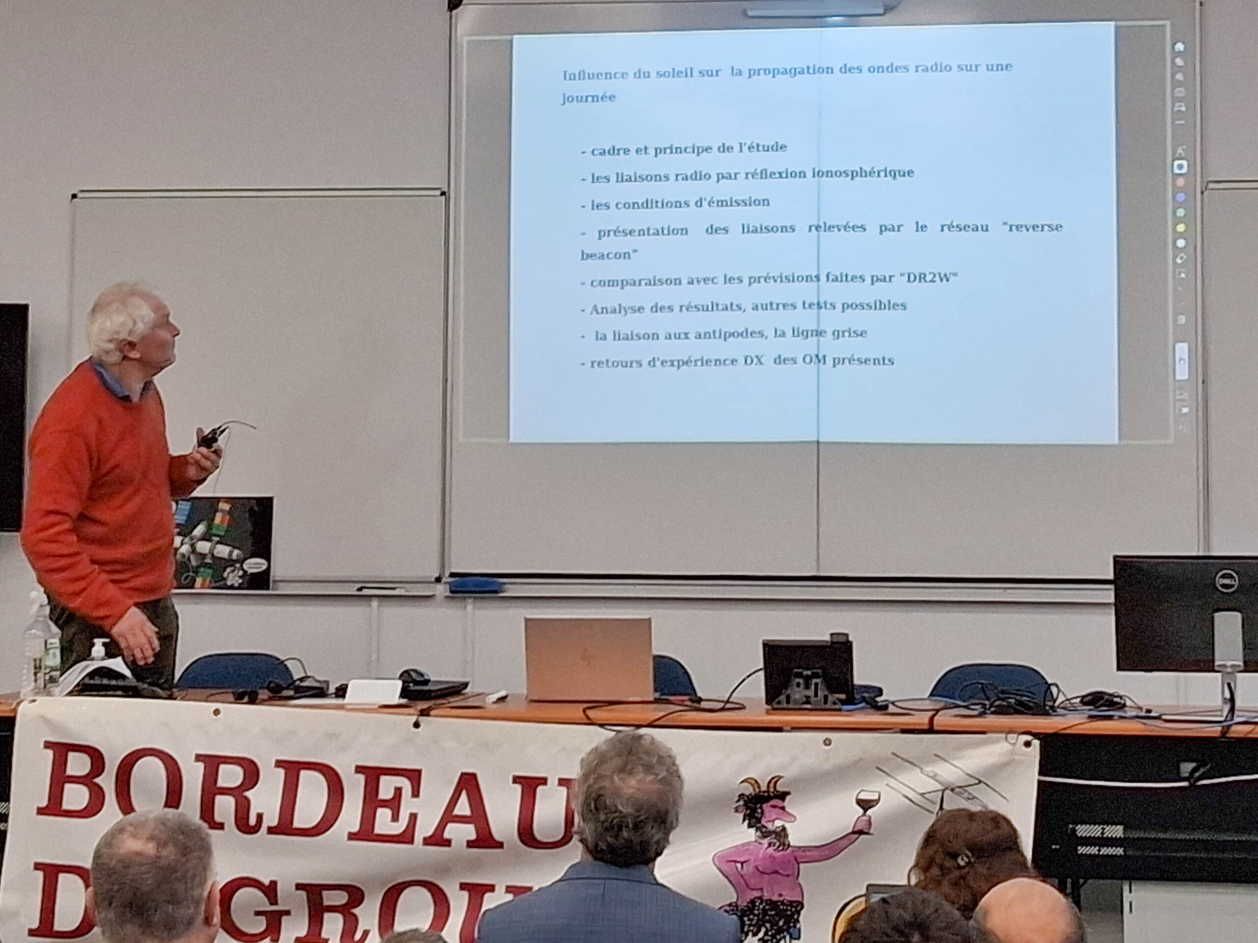 Notre président Guy (F5IBD) présente le travail de Chloé et Hermine pour une expérience de propagation radiofréquence dans le cadre de leur TIPE (Travaux d’Initiative Personnelle Encadrés) en classe préparatoire au lycée Grand Lebrun de Bordeaux.